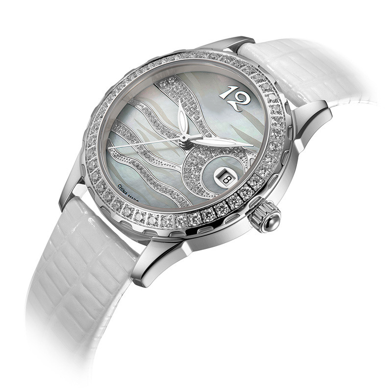 The dial is inlaid with high-quality moissanite, dazzling and luxurious, enhancing the overall appeal of the watch. The unique mother-of-pearl dial offers a distinctive luster and color, making each glance a highlight. The strap is made from genuine leather, providing both comfort and style for everyday wear.